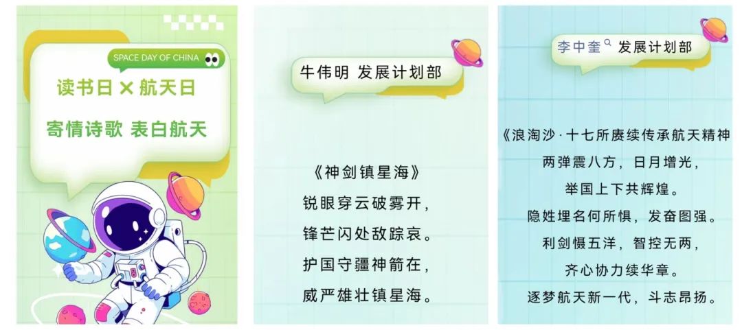 四院17所開展“讀書日X航天日 寄情詩歌 表白航天”活動,向各部門征集航天主題的詩詞,作品韻律優美,展現了航天人的豪情壯志,抒發了對航天事業的無限熱愛。