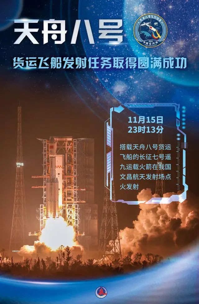 搭載天舟八號貨運飛船的長征七號遙九運載火箭,于北京時間11月15日23時13分在我國文昌航天發射場點火發射。