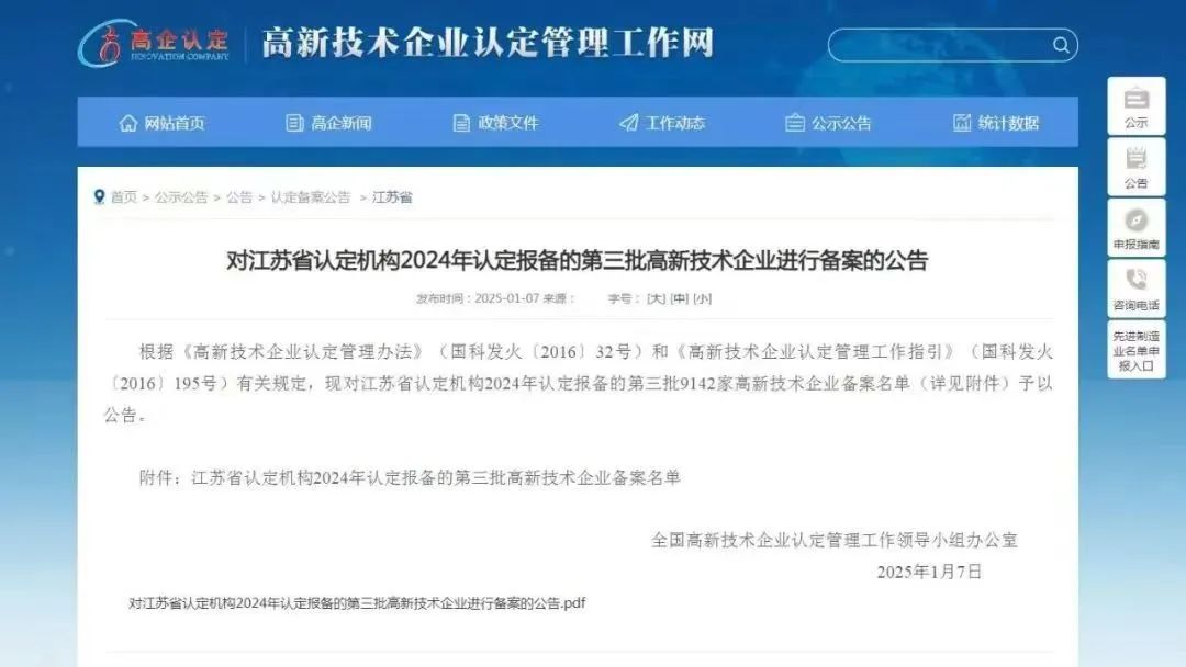 近日,江蘇省認定機構2024年認定報備的第三批高新技術企業備案名單出爐,南京晨光公司再次通過“高新技術企業”認定。此次入選標志著公司在核心自主知識產權、科技成果轉化能力等方面得到國家相關部門的肯定與認可。