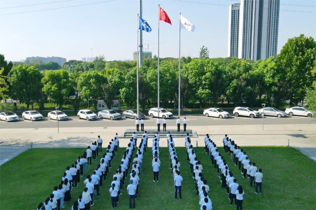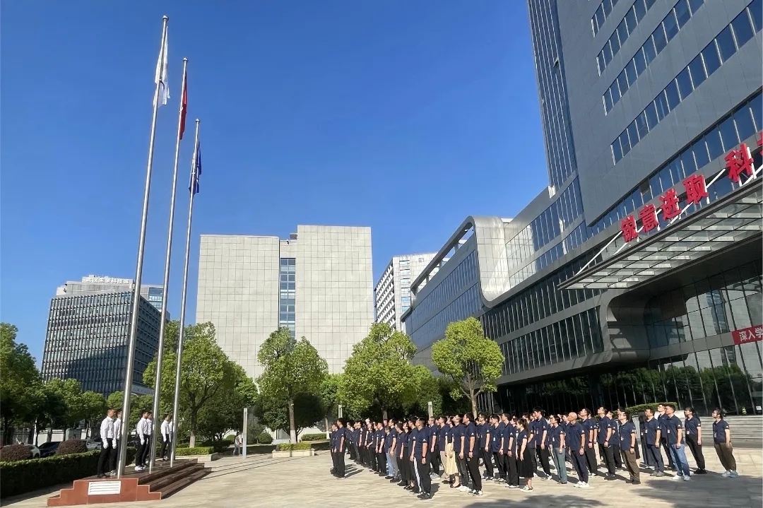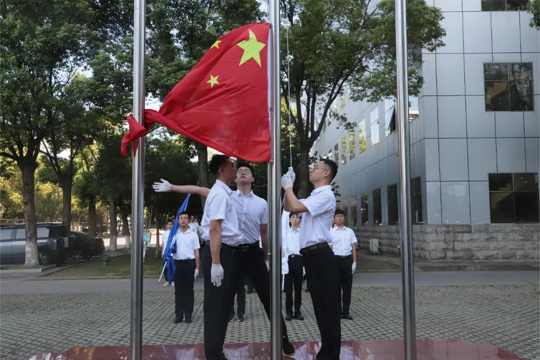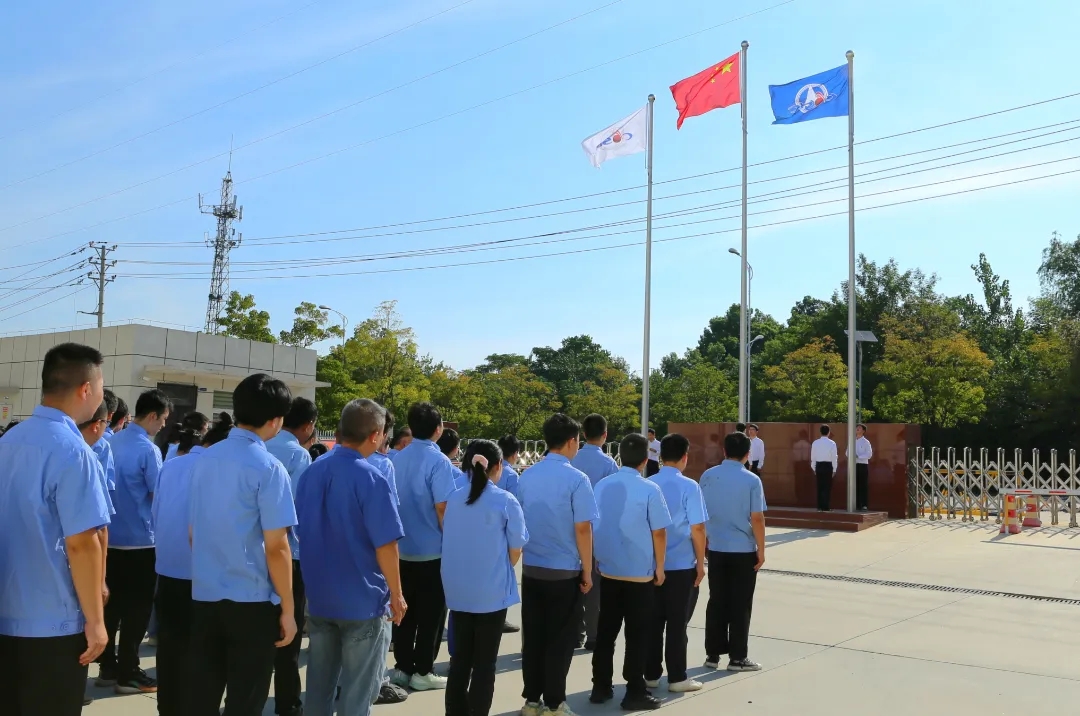 在雄壯的國歌聲中,鮮艷的五星紅旗冉冉升起。在激昂的集團公司司歌聲中,司旗迎風飄揚。