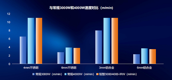 在工藝實測方面,對比常規3000W激光器,銳智系列3000/4000-IRW平均速度提升超40%,其中在6mm鋁合金提升可達52%;對比常規4000W,銳智系列3000/4000-IRW與之薄板切割速度基本持平。