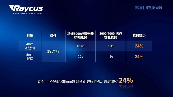 使用常規3000W激光器和銳智系列3000/4000-IRW激光器分別對4mm不銹鋼和8mm碳鋼進行穿孔,其中常規3000W激光器穿孔耗時分別為12.4s和25s,3000/4000-IRW激光器穿孔耗時分別為10s和19s,耗時均減少24%。