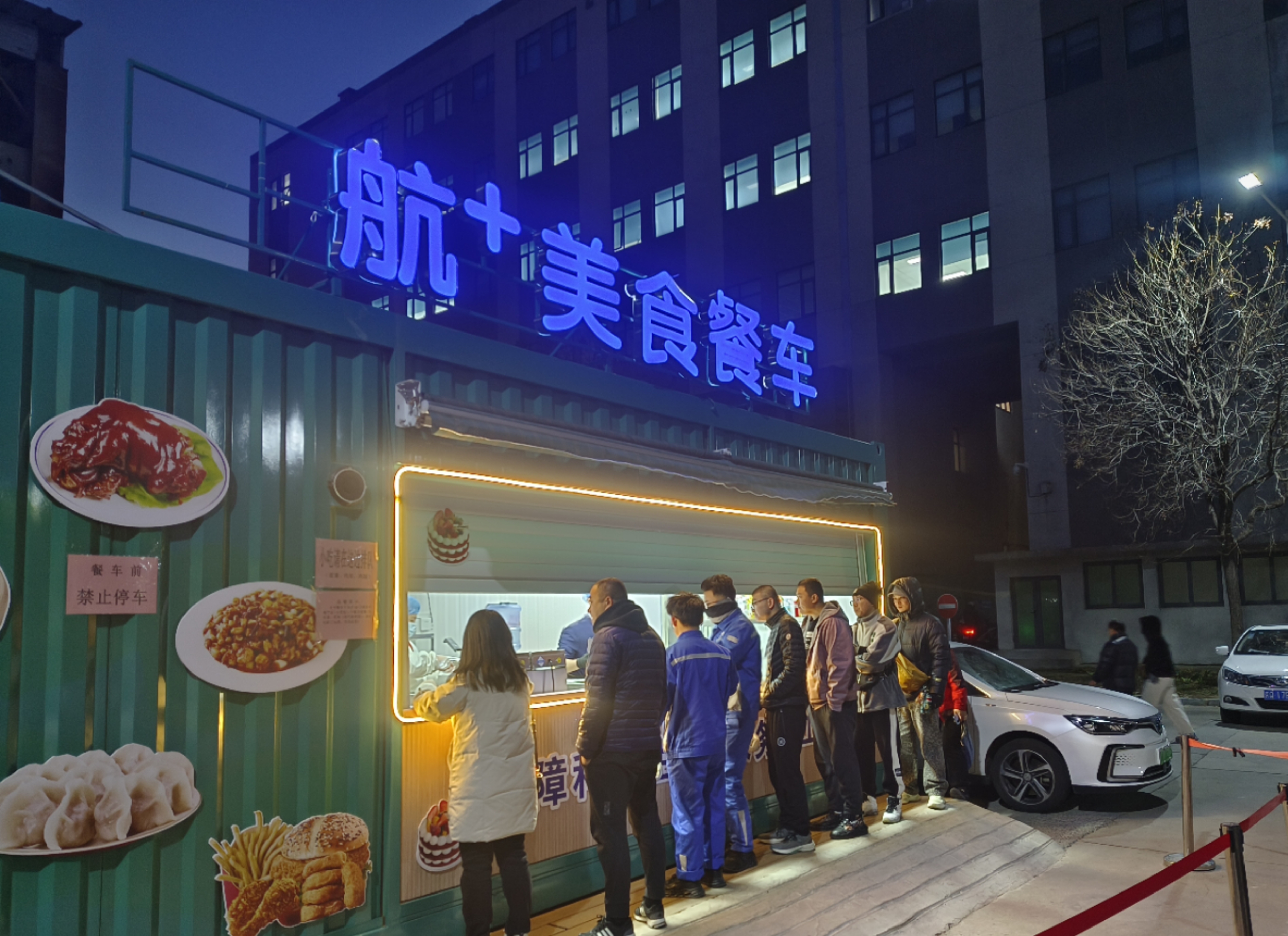 進入四季度以來,科研生產任務繁重,為更好地保障職工用餐服務,工業區內1號餐車供餐時間延長至20點,主要供應鐵板炒飯、炸貨、飲品等,在切實滿足職工多元化用餐需求的同時,也驅散了職工加班的疲憊與冬日的寒意,為接下來的工作充電蓄能。每當夜幕降臨,1號餐車依然燈火通明,守候著工業區內奮力拼搏的二院職工。(文/郭蕊)