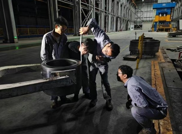 車間內,叉車的轟鳴奏響了奮斗的旋律。一位叉車司機熟練地操作設備,將鍛件穩穩抓起。名技術、生產骨干迅速圍攏過來,手中的卷尺成為他們攻克技術難題的有力“武器”。他們專注地測量每一處尺寸,目光在鍛件與測量數據間來回切換,不放過任何一個細節。