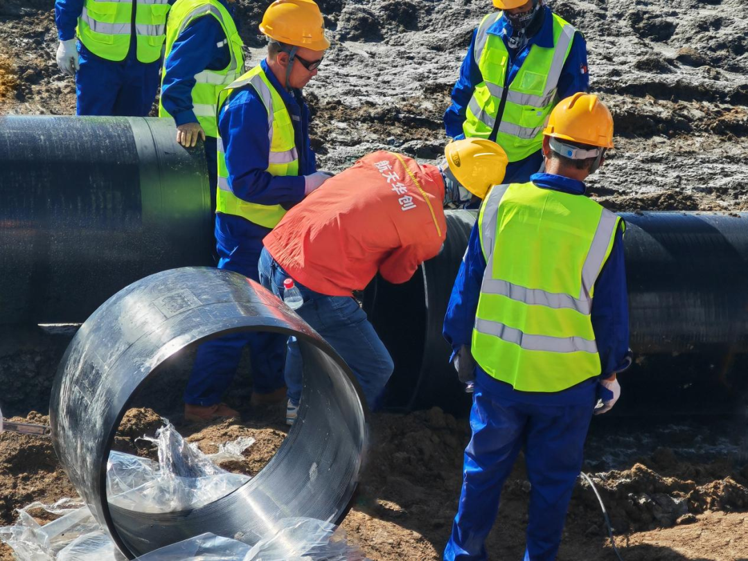 中標喜訊傳來,華創天元第一時間啟動部署。運營管理部精準調度生產計劃,依托數字化系統,打造“最強大腦”,高效協調備貨、發貨;產品制造部開啟“戰時動員”,部門領導、工段長、班組長、技術員、操作員齊上陣,最大限度地保障開線生產;技術質量部嚴格執行“三檢”制度,確保每一根管道“零缺陷”交付;物流部精心規劃產品轉運與包裝防護,讓管材安全、及時地送達項目現場;工程服務部技術人員在施工現場堅守數月,與寒風、缺氧抗爭,以大地、風霜為伴,歷時252天,圓滿完成56公里管道施工打壓試驗任務,打造了DN800規格大口徑鋼骨架管高原施工樣板工程。