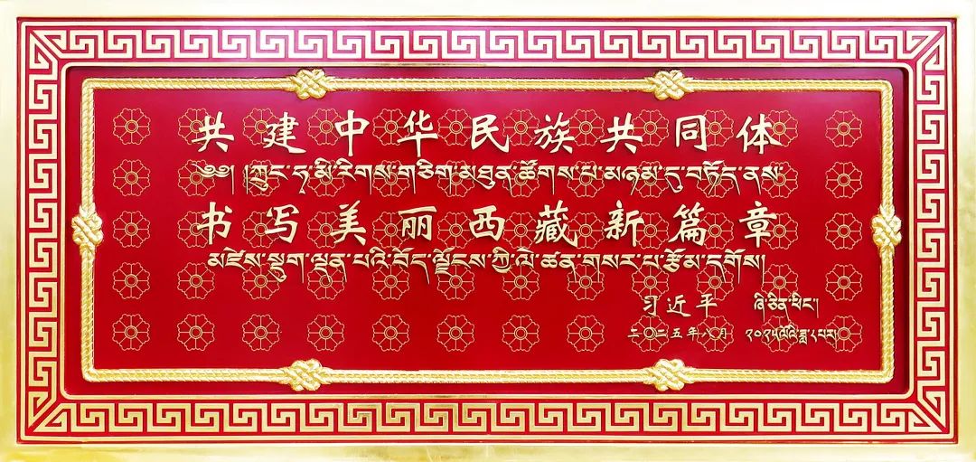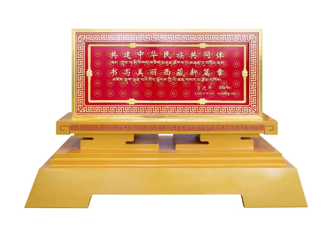 賀匾正面為習近平總書記題詞,背面展現西藏自治區成立60周年經濟社會發展成就。整體造型端莊大氣,以鮮艷的中國紅為底色,采用格桑花紋、長城紋、繩結紋等獨具匠心的特色設計,象征民族團結、共同繁榮,寓意各民族共同熔鑄為中華民族共同體。