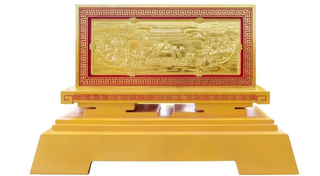 賀匾正面包含多種造型元素,每種元素都需分別進行分色噴涂及貼金處理。為呈現最佳藝術效果,項目團隊深入分析元素特點,采用機加、熔模精密鑄造、化學腐蝕等多種工藝相結合的制造方案,不同工藝之間相互配合,確保賀匾每個細節精致入微。