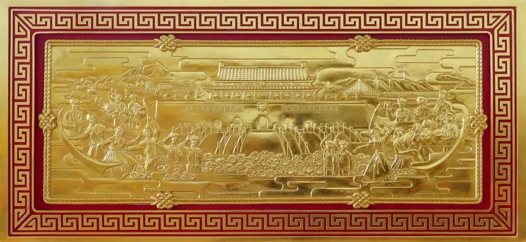 賀匾背面浮雕圖案造型整體采用貼金處理,為了更好體現浮雕效果,項目團隊采用薄壁紫銅板鈑金制作,針對人物面部進行精細鏨刻,完美體現人物面部特點,生動呈現“中華民族一家親”的和諧畫面。