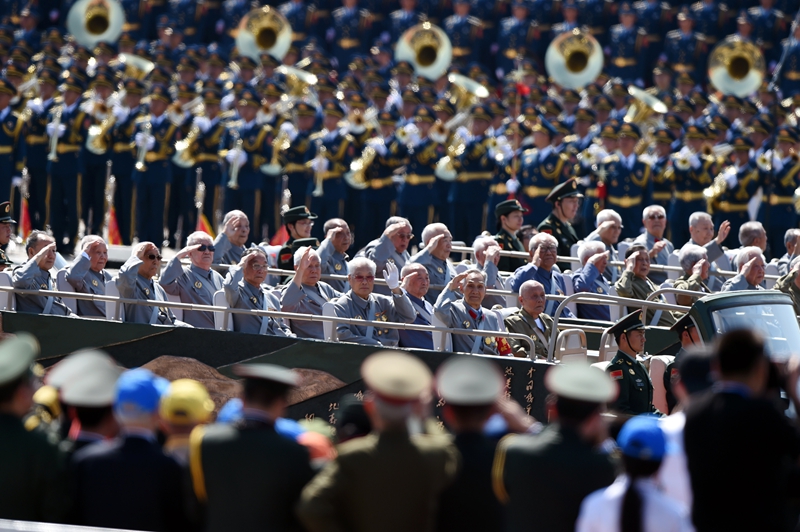 2015年9月3日,中國人民抗日戰爭暨世界反法西斯戰爭勝利70周年紀念大會在北京隆重舉行。這是抗戰老兵乘車方隊通過天安門廣場。新華社記者 王定昶 攝