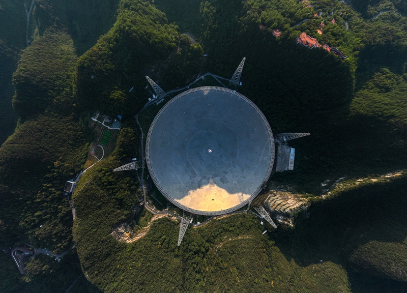 中國天眼在落日余暉中(無人機照片,維護保養期間拍攝,2024年9月25日攝)。新華社記者 劉續 攝