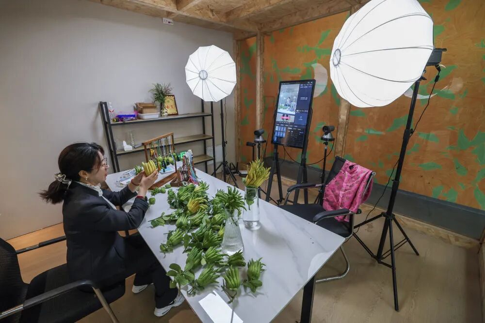 在浙江金華市金東區(qū)赤松鎮(zhèn)北山口村的金華佛手農(nóng)林服務(wù)中心內(nèi)的直播間,工作人員進(jìn)行佛手鮮果及衍生產(chǎn)品的直播銷(xiāo)售(2025年10月22日攝)。新華社記者 徐昱 攝