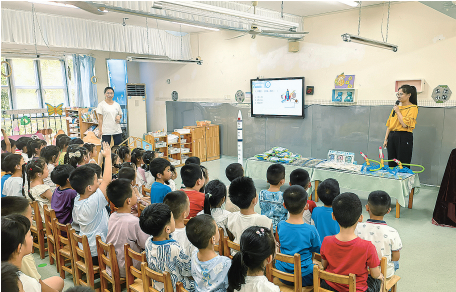 九部職工李申是愛(ài)心托管班服務(wù)團(tuán)隊(duì)中的志愿者,這個(gè)夏天,他成了孩子們最親密的“大朋友”。在安全教育、親子體育競(jìng)技等環(huán)節(jié),李申和同事們利用業(yè)余時(shí)間牽頭策劃,參與教學(xué)互動(dòng),幫助孩子們?cè)谔剿髦惺斋@知識(shí),在活動(dòng)中收獲友誼。