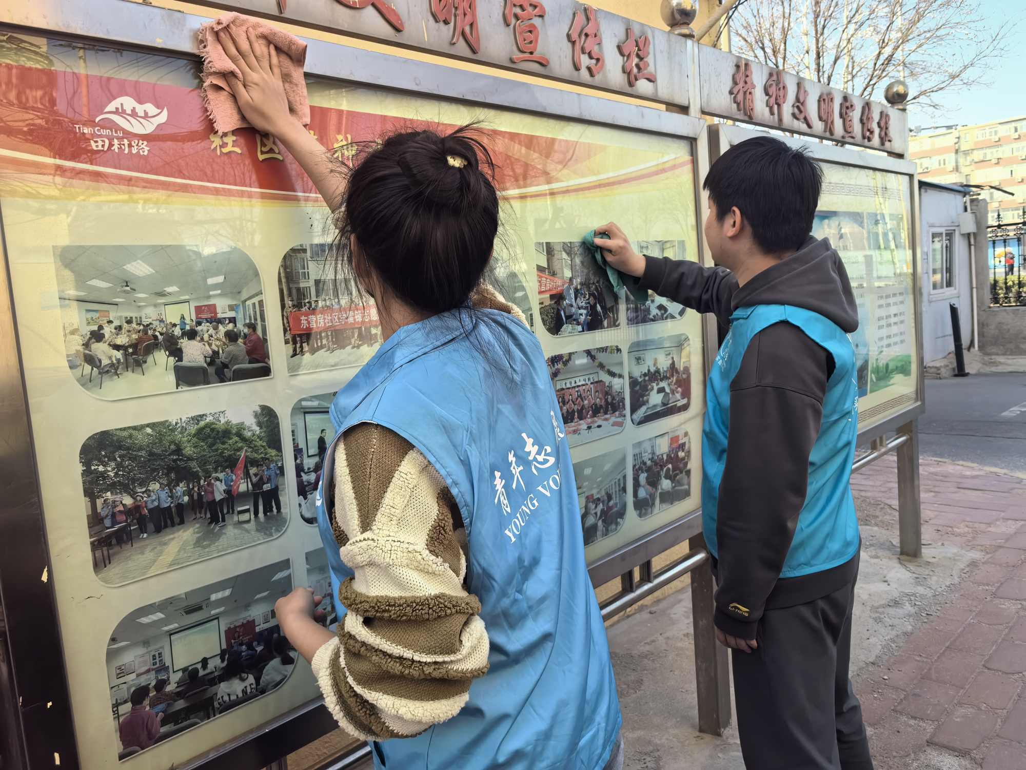 ▲8359所、磁電總體部青年對社區(qū)轄區(qū)內(nèi)的健身器材、宣傳欄、快遞柜等公共區(qū)域進行全面清理,拂去冬日的塵埃、綻放春日的明媚。